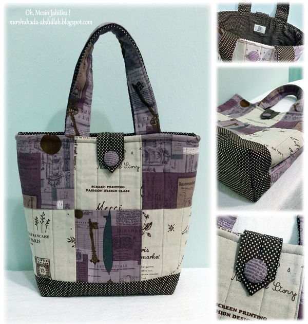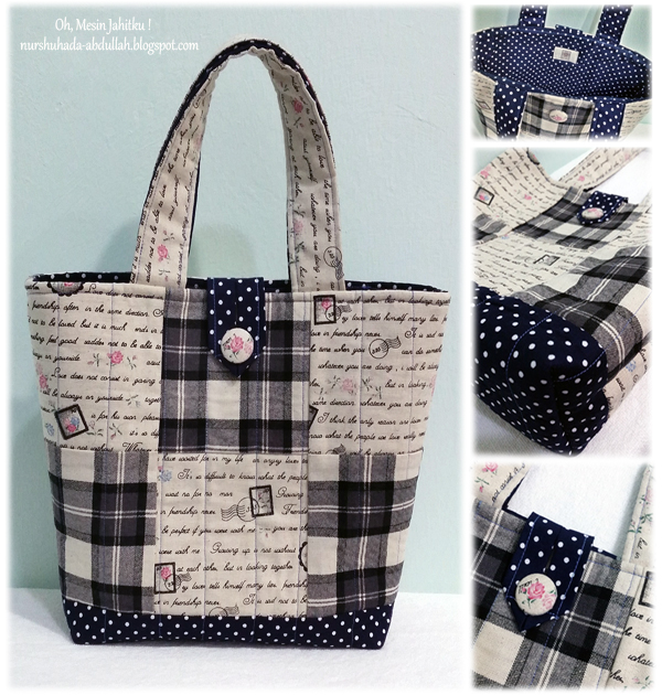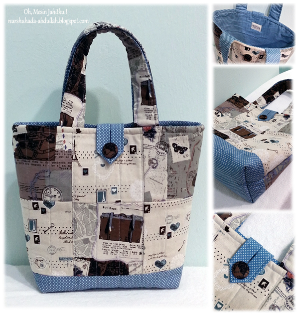 Tote bag ini pula saya gunakan kain panel yang berlebihan. Sekarang, saya juga mula cuba-cuba belajar menggunakan pemegang beg yang readymade. Proses ini lebih mudah bagi saya kerana kita hanya perlu fokus pada jahitan beg itu sendiri, kemudian pemegangnya dipasang selepas beg siap. Cara ini sangat menjimatkan masa, lebih-lebih lagi apabila kita mahu mengurangkan masa menggunting dan menjahit pemegang beg secara manual. Selain itu, beg yang siap juga kelihatan lebih eksklusif, terutamanya bagi mereka yang sudah berpengalaman dalam jahitan.
