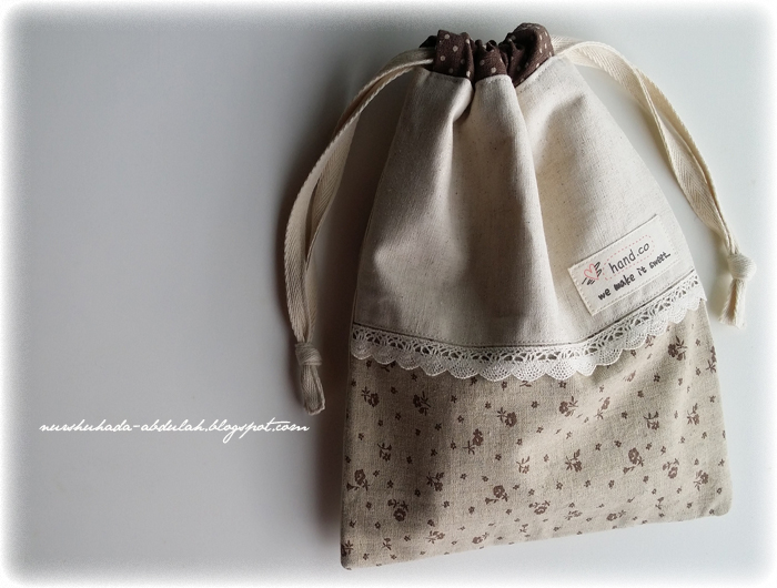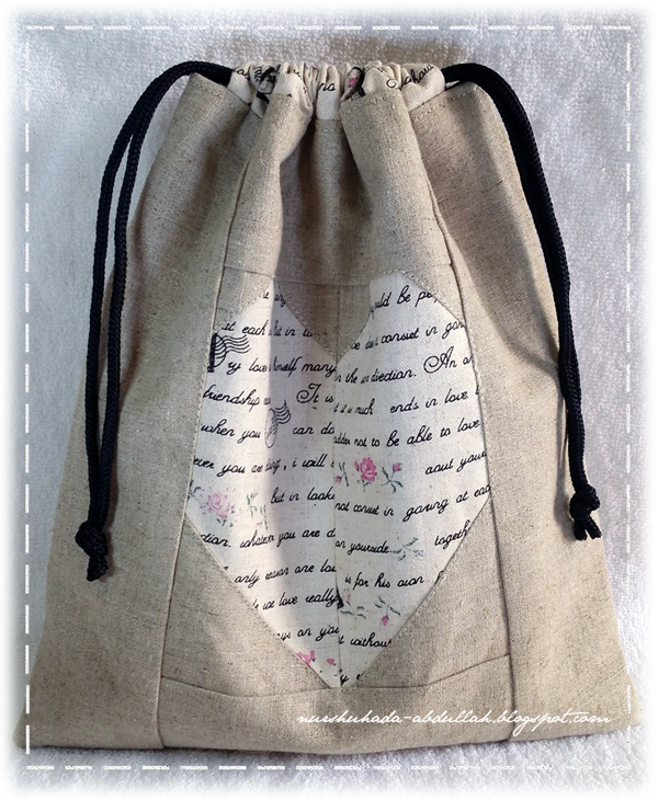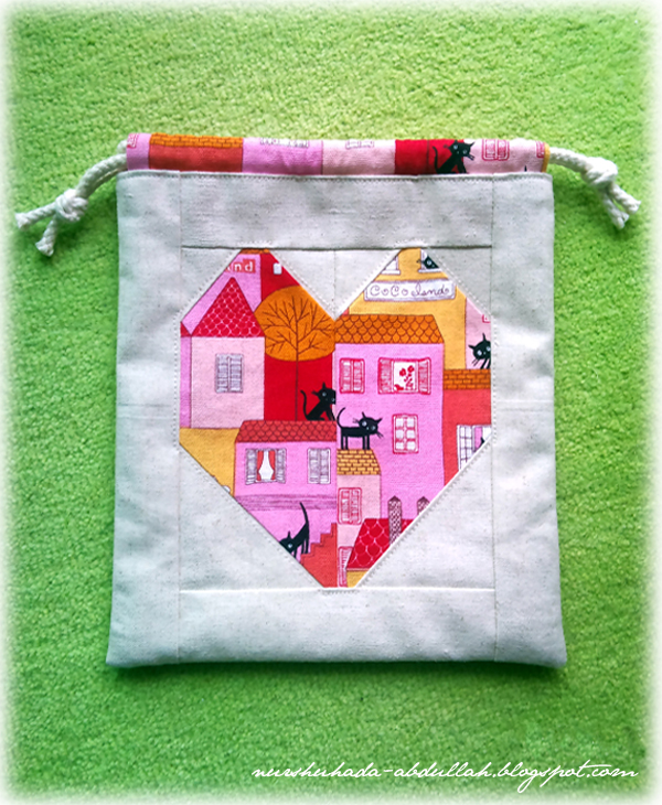 Bila dikumpulkan semula hasil projek jahitan, banyak juga beg jerut atau drawstring bag yang telah saya jahit. Antaranya, beg jerut ini saya jahit untuk dihadiahkan kepada rakan sekerja sempena hari jadinya. Dia seorang pencinta kucing, jadi saya menggunakan kain bercorak kucing dan membuat bentuk hati pada bahagian hadapan beg ini.