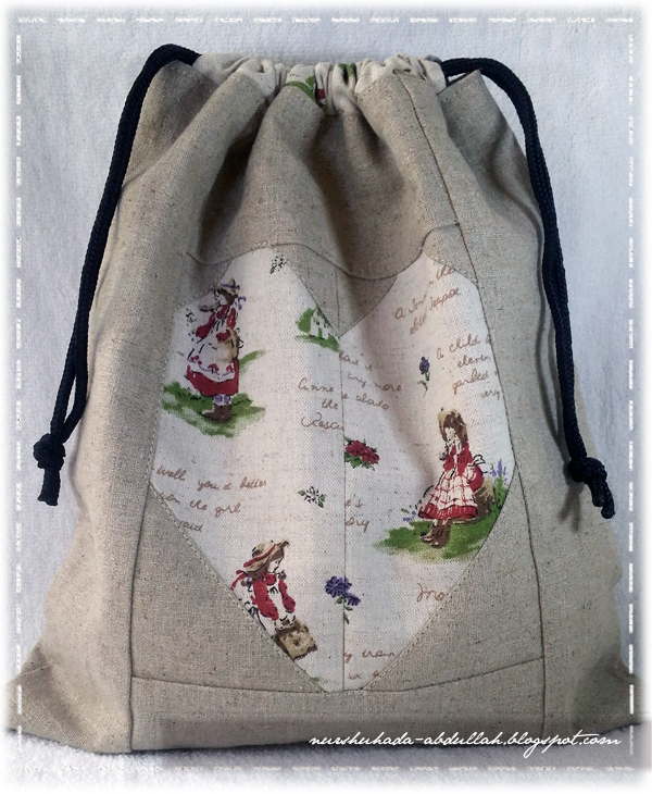 Kesemua beg jerut yang saya jahit ini mempunyai saiz yang sama, iaitu 11 inci panjang dan 9 inci lebar (28 cm x 23 cm). Pada bahagian luar beg jerut ini, saya menggunakan kain linen, manakala di bahagian dalamnya pula, saya menggunakan kain cotton.