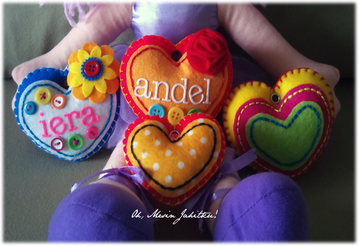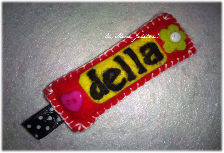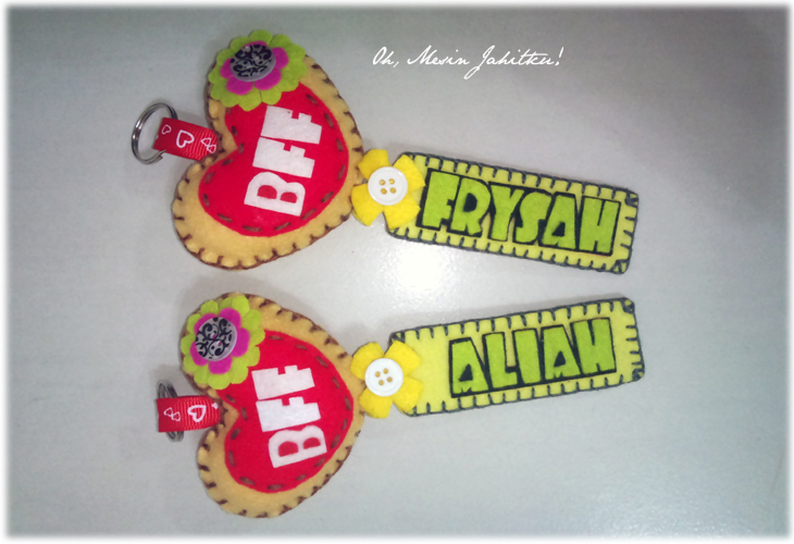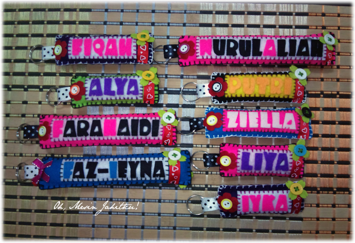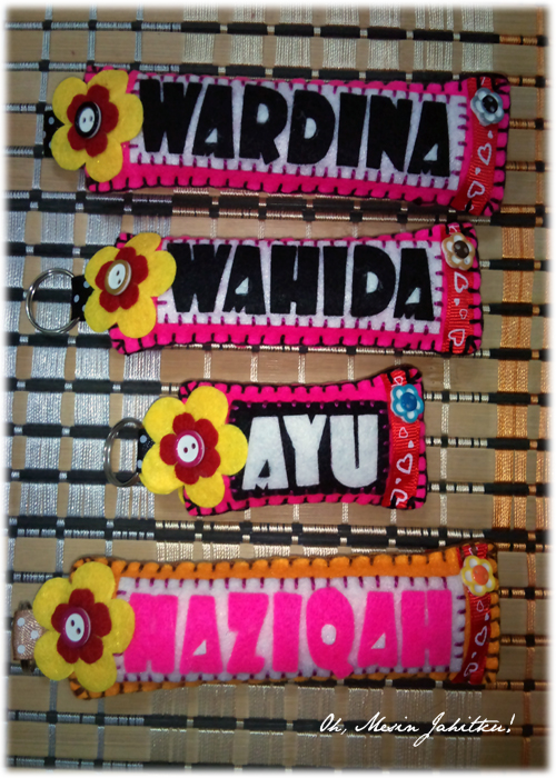 Sebelum minat menjahit, saya bermula dengan aktivitik kraf felt sekitar tahun 2012. Masa itu, sempat juga saya mengambil tempahan. Gambar di atas adalah kraf felt pertama saya – keychain nama yang saya buat untuk adik. Budak baru belajar, jadi jahitan insang pari pun nampak tak kemas dan tak seimbang. Gam pula comot di sana sini. Gambar pun kabur dan gelap.