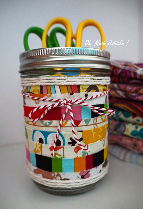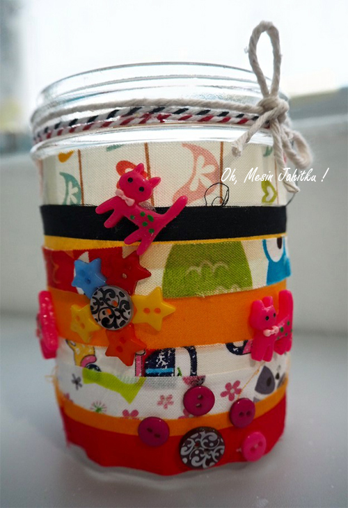 Projek kraf pada permulaan tahun 2016. Selalu tengok botol tempat menyimpan gunting ini kosong saja, jadi hari ini saya nak bagi dia ‘pakai baju’ pula. Sekurang-kurangnya, ceria sikit mata saya tengok warna-warni macam ini. Nak buat pun mudah saja. Kain dengan pelbagai corak digunting panjang-panjang, kemudian lilitkan pada botol. Tampal menggunakan gam UHU. Kalau ada tali atau lace, boleh buat riben. Ikut kreativiti masing-masing. Dah siap!