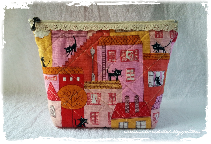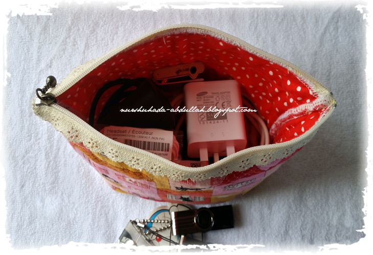Pouch bag ini sedikit berbeza kerana ia menggunakan zip lace. Selalunya saya menggunakan zip biasa sahaja, kali ini saya cuba zip lace kerana nampak lebih menarik.