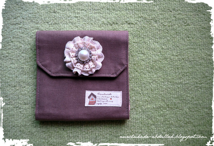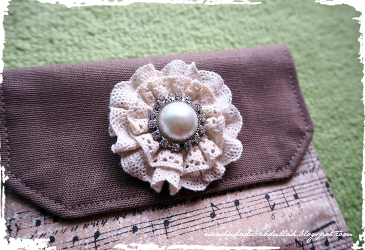 Di bahagian hadapan pouch bag ini, saya letakkan bunga lace menggantikan butang. Di rumah, tiada butang bersaiz besar. Saya lekatkan bunga lace ini dengan gam UHU.