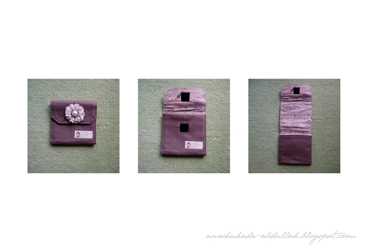Pouch bag ini bersaiz lebih kurang 5 inci x 5 inci apabila dalam keadaan bertutup. Di bahagian luar, saya menggunakan kain linen manakala di bahagian dalam pula kain cotton. Cara jahitan dan ukuran kain semuanya telah dinyatakan dalam buku. Namun, pouch bag saya ini tidaklah 100% mengikut apa yang ditulis. Ada beberapa bahagian yang saya rasa sukar untuk diikuti, saya guna cara sendiri.