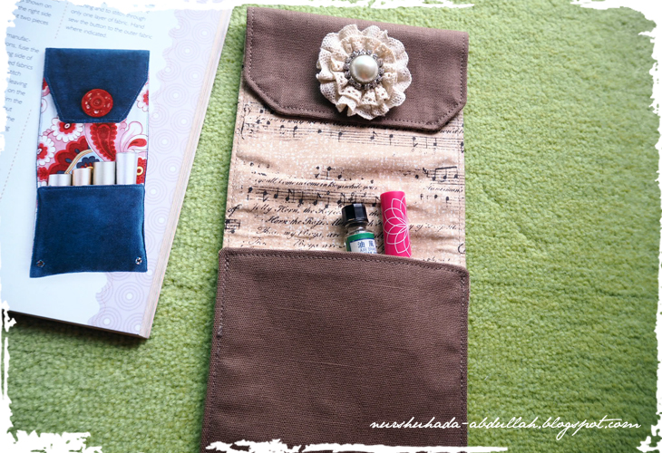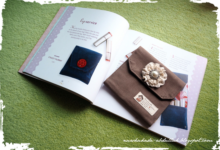 Ini adalah salah satu projek jahitan dari buku Pretty Little Cozies yang saya pernah beli dulu. Beg ini digunakan untuk menyimpan alatan solek yang bersaiz kecil seperti gincu. Untuk saya pula, saya letakkan pelembap bibir, bedak kompak dan minyak cap kapak – barang wajib.